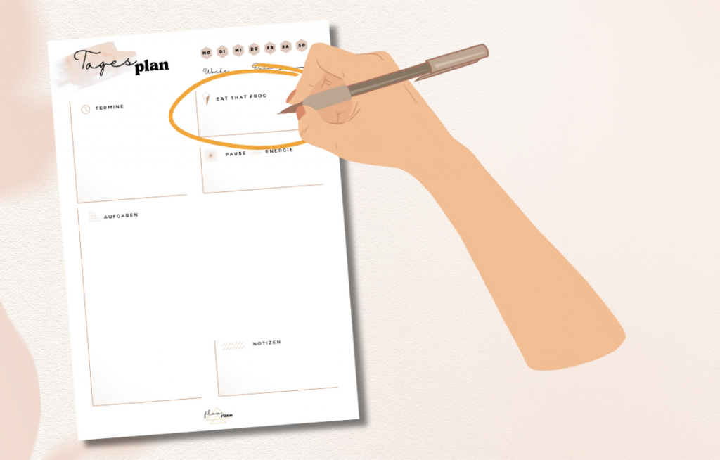 Wenn du auf dem Gebiet des Zeitmanagements nicht ganz neu bist, hast du sicher schon von dem Prinzip „eat that frog“ gehört. Sinnbildlich isst man einen großen, schleimigen Frosch am Morgen, denn dann kann nichts schlimmeres mehr passieren. Bei dieser Methode geht es also darum, die größte, wichtigste Aufgabe des Tages direkt zu Beginn zu erledigen. Was solltest du heute unbedingt schaffen? Was bringt dich deinem Ziel heute ein Stück näher? Wo läuft gerade eine Deadline ab?