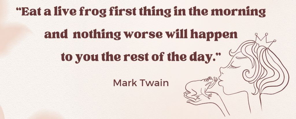 Schon allein die Tatsache, dass du dir darüber Gedanken machst, welche Aufgabe heute die wichtigste ist und dass du sie für dich priorisierst, sorgt für so viel mehr Klarheit und Produktivität. Am besten notierst du dir deine eat-that-frog-Aufgabe bereits am Vortag, um am nächsten Morgen ganz entschlossen und zielstrebig ans Werk zu gehen (siehe auch hier). Bleib dir treu und kümmere dich zuerst konsequent nur um deinen „Frosch“, bevor du irgendetwas anderes machst. Plan dir ein angemessenes Zeitfenster ein, in der du alle Störquellen (Handy, Mailprogramme, etc.) ausschaltest und ganz fokussiert an deiner Aufgabe arbeitest. Wenn du diese Aufgabe erledigt hast, fühlt sich alles andere danach an wie ein Kinderspiel.