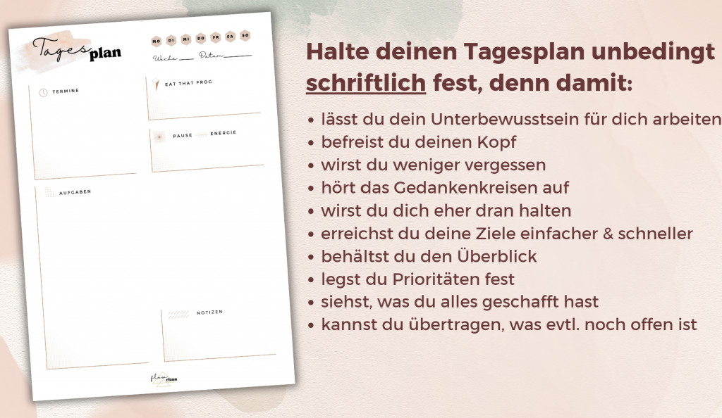 Klar, dauert es vielleicht ein paar Minuten den Tagesplan zu erstellen. Aber das ist es absolut wert für die Klarheit sowie den Boost an Motivation und Produktivität und nicht zuletzt das gute Gefühl am Ende des Tages 🙂
